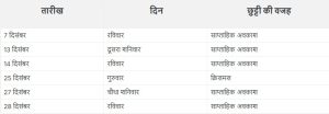 इनके अलावा दिसंबर में 7, 14, 21 और 28 को रविवार है। जिसके कारण स्कूलों में अवकाश रहेगा। साथ ही 25 दिसंबर को क्रिसमस दिवस को लेकर अवकाश रहेगा। इस प्रकार से दिसंबर के महीने में 10 से 11 दिन तक अवकाश रहेगा।