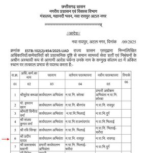 रवि लावण्य ज़ोन स्वास्थ्य अधिकारी का कोरबा नगर निगम में ट्रांसफर हुआ है. संतोष वर्मा राजस्व उपनिरीक्षक का राजनांदगांव, रोशन देव रात्रे उप अभियंता का जगदलपुर नगर निगम, उमेश नामदेव जोन स्वास्थ्य अधिकारी का जगदलपुर नगर निगम, प्रदीप यादव कार्यपालन अभियंता मैकेनिकल रायपुर का रायगढ़ नगर निगम में ट्रांसफर हुआ है.