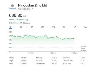 शुक्रवार 26 दिसंबर को भले ही शेयर बाजार में गिरावट देखने को मिली हो, लेकिन हिंदुस्तान जिंक के शेयर ने अपने प्रदर्शन से सभी को हैरान कर दिया। बीएसई में कंपनी के शेयर पिछले क्लोजिंग प्राइस 624.85 के मुकाबले 645 रुपये के स्तर पर खुले और दिनभर की ट्रेडिंग में 3 प्रतिशत की तेजी के साथ 646.50 रुपये के इंट्रा-डे हाई पर पहुंच गए। यह कंपनी का नया 52 सप्ताह का उच्च स्तर है। पिछले चार कारोबारी दिनों में भी शेयर में लगातार तेजी देखने को मिली है। बीते 30 दिनों में यह स्टॉक निवेशकों को 35.87 प्रतिशत से ज्यादा रिटर्न दे चुका है।