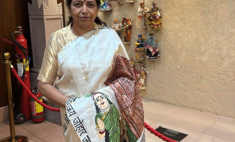 • साड़ी की किनारी पर पारंपरिक अभिवादन ‘जय जोहार’ अंकित था, जो भाईचारे और सरलता का प्रतीक है।