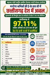 महात्मा गांधी राष्ट्रीय ग्रामीण रोजगार गारंटी योजना (मनरेगा) के अंतर्गत श्रमिकों के ई-के वाय सी कार्य में छत्तीसगढ़ ने पूरे देश में प्रथम स्थान प्राप्त कर उल्लेखनीय उपलब्धि हासिल की है। भारत सरकार द्वारा जारी ताजा रिपोर्ट के अनुसार प्रदेश में 97.11 प्रतिशत सक्रिय श्रमिकों का ई-के वाय सी पूर्ण कर लिया गया है, जो राष्ट्रीय स्तर पर सर्वाधिक है। खास बात यह है कि छत्तीसगढ़ ने केरलम, त्रिपुरा, मिजोरम जैसे छोटे राज्यों तथा कर्नाटक, तमिलनाडु जैसे बड़े राज्यों को भी पछाड़कर यह उपलब्धि हासिल की है।
